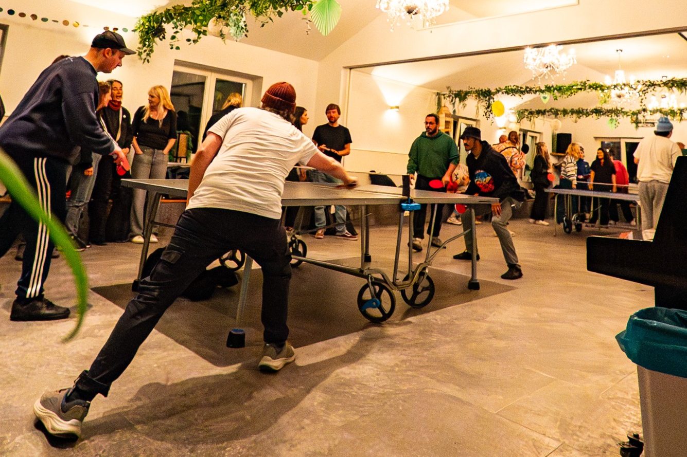 Im ganzen Haus stehen Tischtennisplatten bereit, Schläger bekommt ihr vor Ort, falls ihr keine eigenen habt. Dazu gibt’s kalte Drinks, Bier vom Fass und den passenden Soundtrack für den besten Donnerstag.